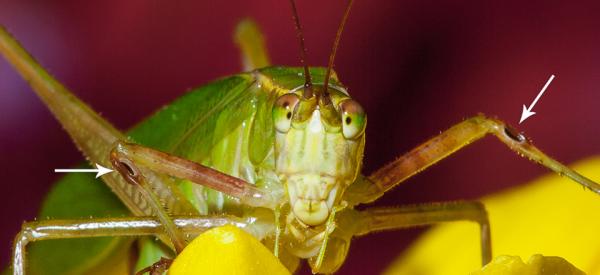 . Ảnh: 2il.orgThời trang "tai": Côn trùng cũng có tai nhưng mỗi loài lại có một kiểu tai khác nhau giống như thời trang vậy và rất hiếm khi tai mọc trên đầu. Chẳng hạn như các loài thuộc bộ cánh gân Neuroptera có tai đặt trên các cánh. Trong khi đó, dế hay muỗm lại có các mảng nhạy âm thanh mỏng trên các chân (hình trên). Châu chấu mặc dù khá giống muỗm hay dế nhưng lại có tai đặt ở bụng. Tachinid - một loài ruồi ký sinh có tai đặt ở cổ trong khi nhiều loài ngài cánh hẹp lại có khả năng phát hiện rung động siêu âm nhờ những thành phần đặc biệt trong miệng để tránh sự săn đuổi của dơi.